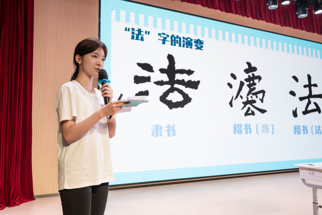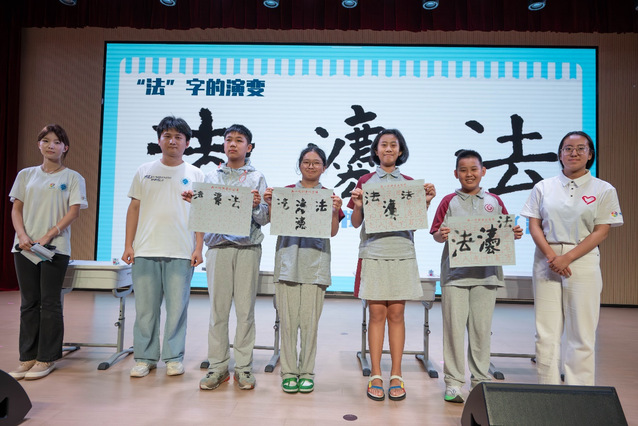 活动最后,朱雪菲介绍“法”字的演变过程,组织同学们上台书写不同时代的“法”字,强调法律在生活中的调节作用,引导同学们遇事找法、用法。