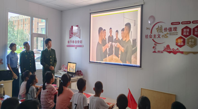 (图为退役员工与孩子们一同观看军营生活短视频)