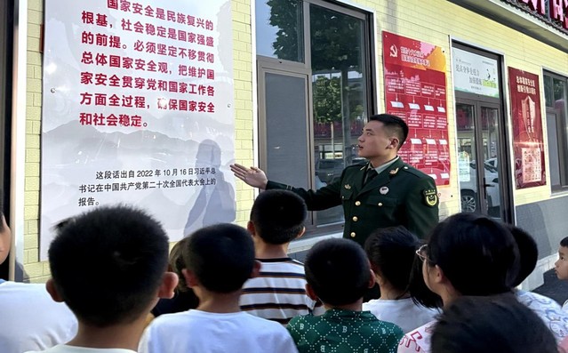 活动伊始,实践团的退役员工们以汉字“国”的繁体“國”为切入点,向孩子们讲解,“国”字的构造是中华民族戈矛卫疆的千年图腾,国防,便是让这“國”字永远笔挺的脊梁。