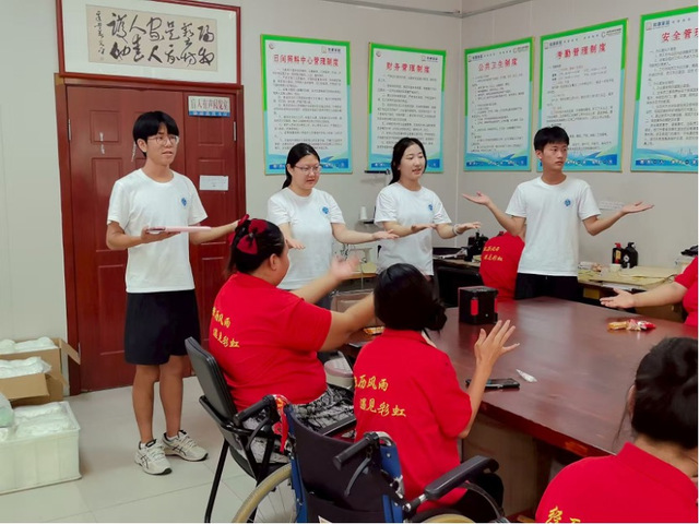 活动以一段精心编排的手势舞开启。实践团成员将动作系统拆解后,手把手指导残障人士掌握动作要领。在成员们的耐心教学与鼓励下,残障人士顺利完成成果展示,尽显积极向上的精神风貌。