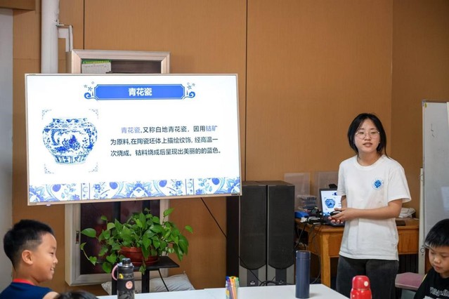 (图为实践团成员刘柯含讲解青花瓷的相关知识)