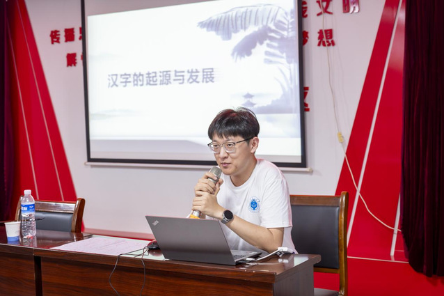 (图为曹艺宝讲解汉字的起源与发展)