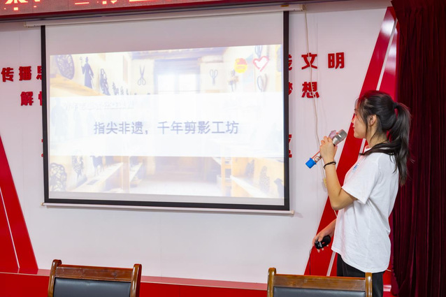 在“指尖非遗”环节,实践团成员孙语以唐诗引入,向员工们介绍非物质文化遗产的定义,并展示风筝、昆曲、制茶等部分非遗项目的图片。孙语重点讲解了剪纸艺术的分类特点和制作方法。讲解结束后,志愿者向在场员工分发剪纸工具和材料。员工们在志愿者的指导下,对照着参考图案,使用剪刀和彩纸完成简易的剪纸作品。