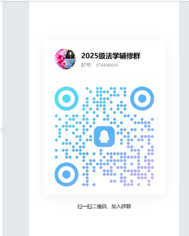 点击链接加入群聊【2025级法学辅修群】:https://qm.qq.com/q/2M84gtEwFG