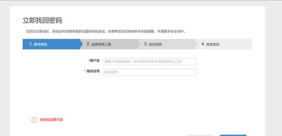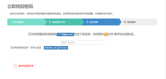 ②按照四个步骤分别输入信息、验证邮箱或密保问题即可修改密码。