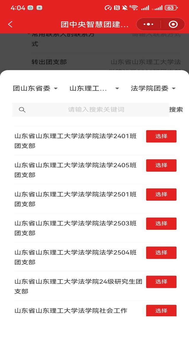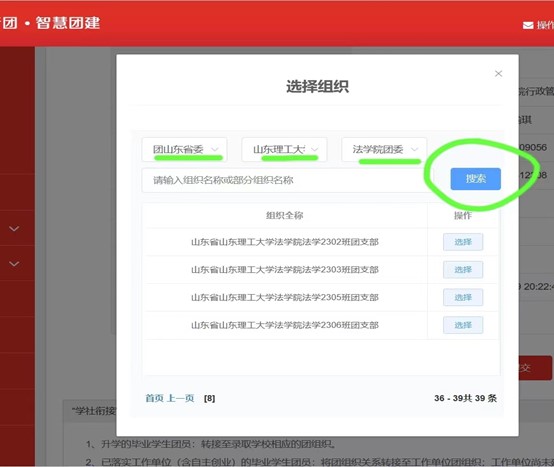 依次选择“团山东省委-w88win体育官网入口团委-w88win体育官网入口团委”-“输入组织名称—山东省w88win体育官网入口法学/社会工作250*班团支部”或在下方直接找寻对应班级也可。