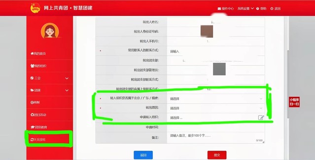 *处必填,“转入组织是否属于北京/广东/福建:”选择“否”;