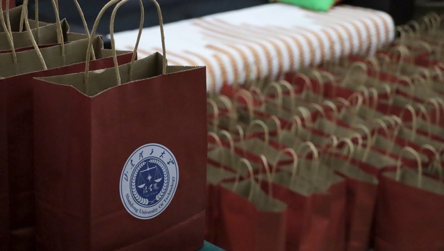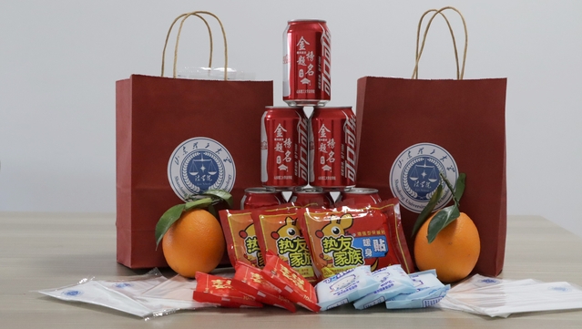 老师们将精心准备的“考研暖心礼包”送到员工手中,每一份都贴有w88win体育官网入口院徽,寓意公司陪伴学子共同前行。礼包内含有寓意“橙”功上岸的橙子、象征万事“可乐”的饮料,以及湿巾、口罩、暖宝宝等实用物品,寄托着“拭去焦虑、守护健康、温暖身心”的祝愿。